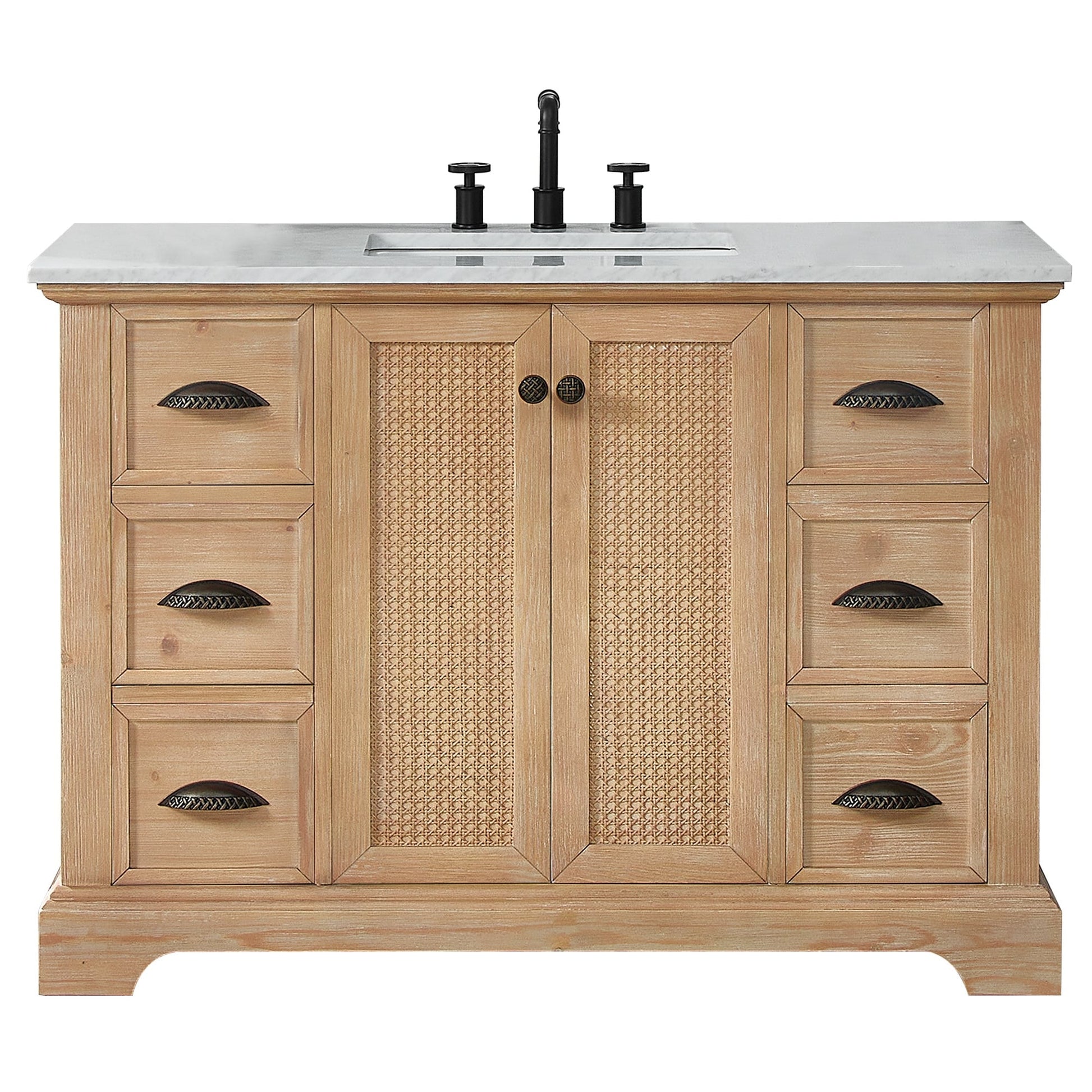 48 pouces - Deux portes à fermeture douce avec un panneau en rotin et bambou et six tiroirs à queue d'aronde robustes à fermeture douce.