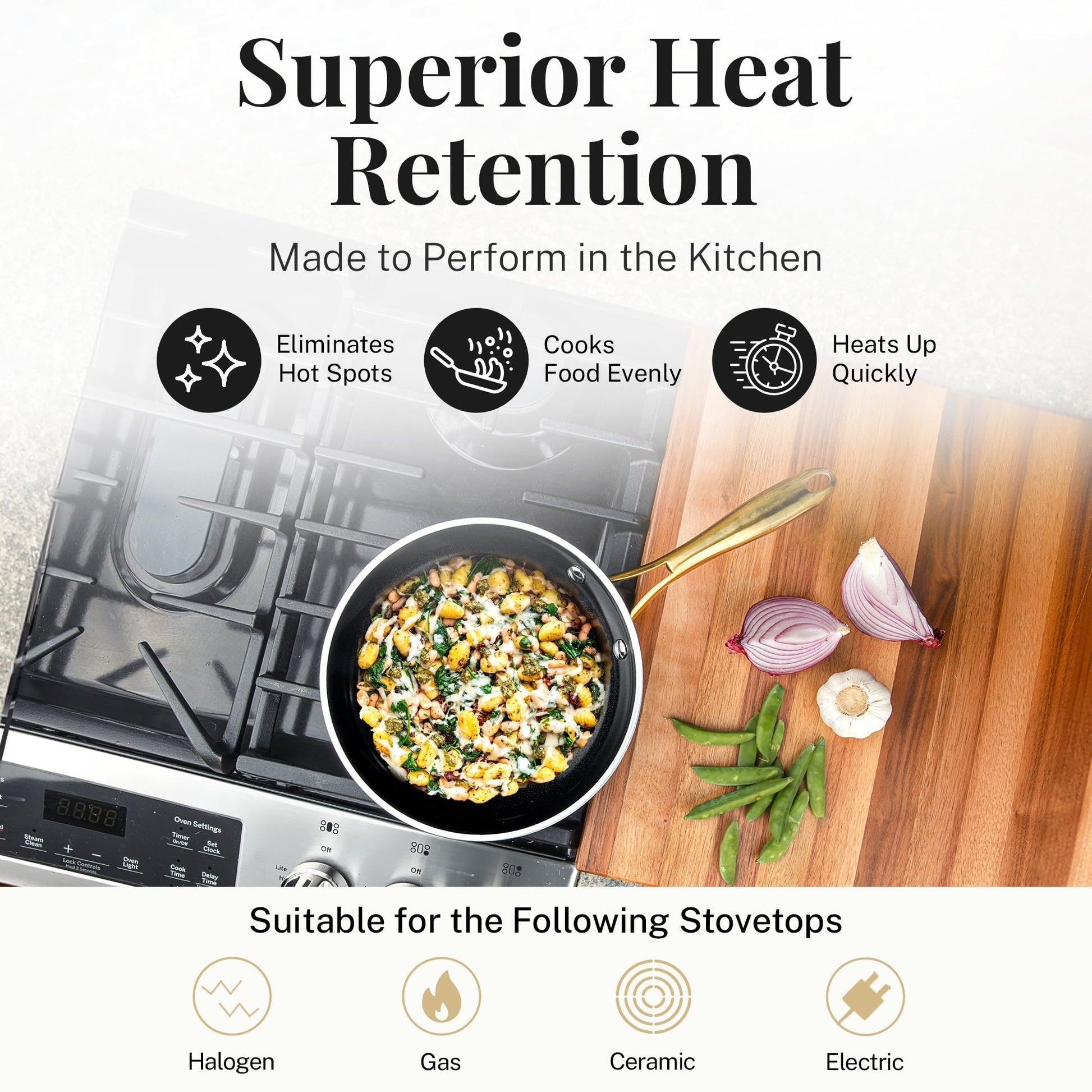 • Polyvalence du four et de la cuisinière : Convient aux cuisinières à gaz, électriques, en céramique et halogènes, et au four jusqu'à 500 °F, permettant une flexibilité de cuisson de la cuisinière au four.