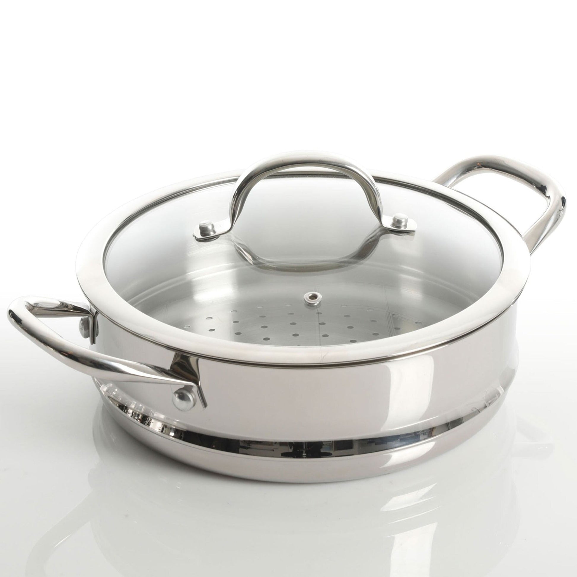 Cuisinez et créez vos plats les plus originaux avec cette batterie de cuisine 10 pièces en acier inoxydable épais. Fournissant tout le nécessaire, cette batterie de cuisine permet aux chefs de tous niveaux de frire, sauter, saisir, cuire à la vapeur, bouillir et cuire au four. Leur corps en acier inoxydable épais est compatible avec toutes les plaques de cuisson. La cocotte et les poêles sont équipées de couvercles en verre résistant à la chaleur avec évents pour une surveillance facile de la cuisson ! Cuire des légumes à la vapeur, faire sauter des nouilles, faire frire du poulet, remuer des sauces tomates savoureuses et plus encore. Ensemble : Batterie de cuisine Matériau : acier inoxydable épais Finition : polie Poignées : acier inoxydable Compatible avec toutes les plaques de cuisson Lavage à la main uniquement L'ensemble comprend : Une casserole de 1 pinte avec poignée et couvercle de 6,25 pouces Une casserole de 2,5 pintes avec poignée et couvercle de 7 pouces Une poêle à frire de 9,5 pouces avec poignée de 7,25 pouces Un panier vapeur avec poignées de 2 pouces Une sauteuse de 4,4 pintes avec poignées de 8,5 pouces et 2 pouces et couvercle Un faitout de 5 pintes avec poignées et couvercle Dimensions par article : Casserole de 1 pinte : 12,25 pouces de longueur, 6 pouces de largeur, 3 pouces de hauteur, capacité de 1 pinte, poids de 1 lb Casserole de 2,5 pintes : 14,25 pouces de longueur, 7,75 pouces de largeur, 4 pouces de hauteur, capacité de 2,5 pintes, 1,75 lb Poêle à frire de 9,5 po : longueur de 17 po, largeur de 10 po, hauteur de 2,25 po, capacité de 48 oz, poids de 2 lb. Insert de cuisson à la vapeur : longueur de 14 po, largeur de 10 po, hauteur de 3 po, poids de 1 lb. Sauteuse de 4,4 pintes : longueur de 22 po, largeur de 11,5 po, hauteur de 3 po, capacité de 4,4 pintes, poids de 3,55 lb. Faitout de 5 pintes : longueur de 13,75 po, largeur de 10 po, hauteur de 4,5 po, capacité de 5 pintes, poids de 2,8 lb.