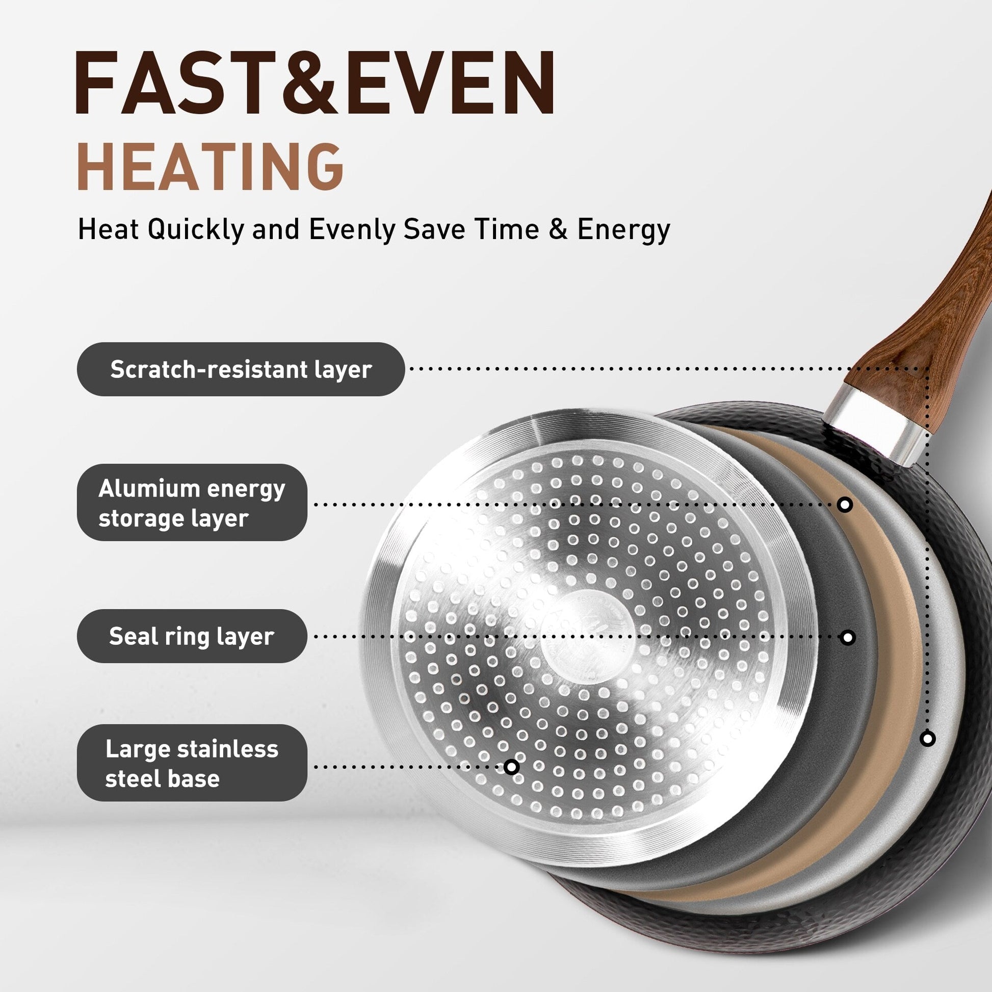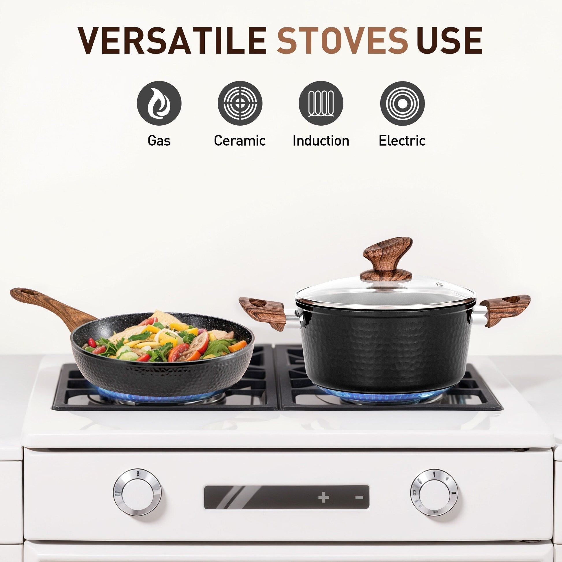 • L'ensemble comprend des poêles à frire de 8,15 pouces et 9,75 pouces, des casseroles de 1,5 pinte et 3 pintes avec couvercles, des cocottes de 3 pintes et 5 pintes avec couvercles et 5 ustensiles en nylon