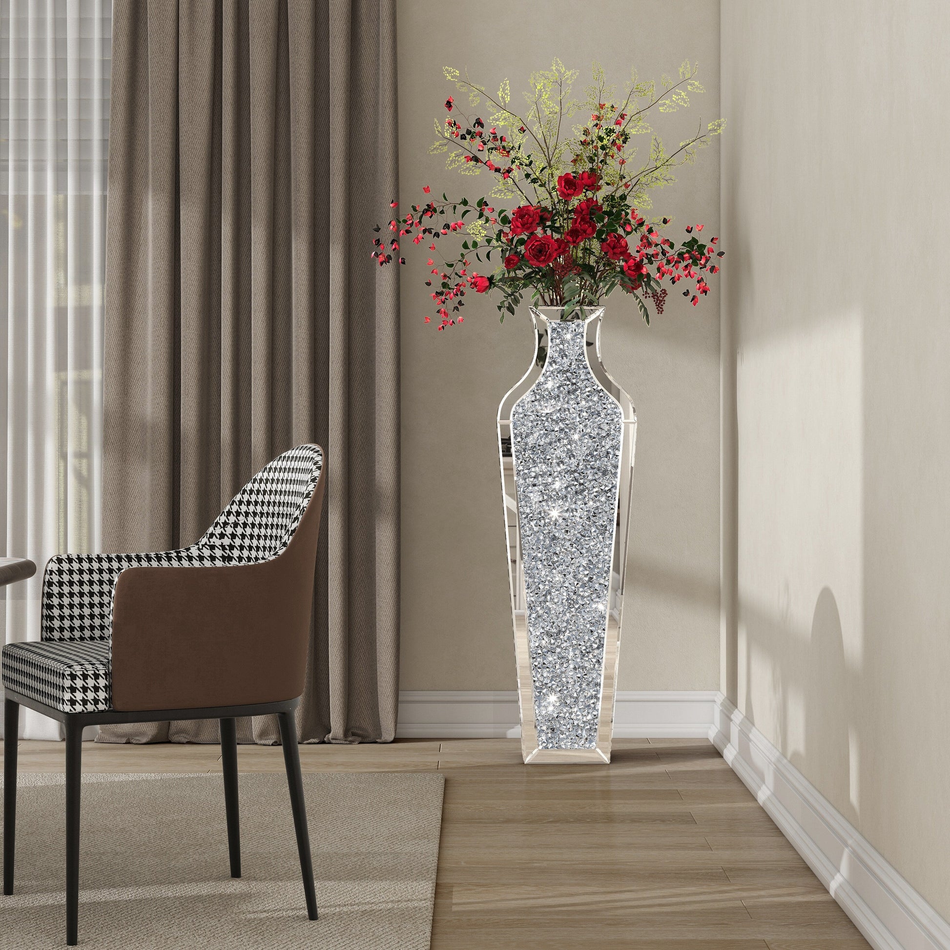 Si vous aimez décorer votre intérieur, ce vase de sol sera le choix idéal. Il trouvera sa place dans n'importe quel coin, notamment à l'entrée, près du meuble TV ou au milieu du canapé. Appréciez son design sur des fonds unis dans un cadre élégant. Il constitue une décoration unique sur une cheminée, une console ou tout autre espace de vie. Doté d'un plateau en miroir et d'un corps en diamants concassés, ce vase de sol décoratif, orné de plantes et de fleurs, apportera luminosité et texture à votre intérieur. Convient pour une utilisation en intérieur. Style glamour. Ouverture de 11,7 cm, miroir argenté de 70,9 cm, 91,4 cm et 110 cm.