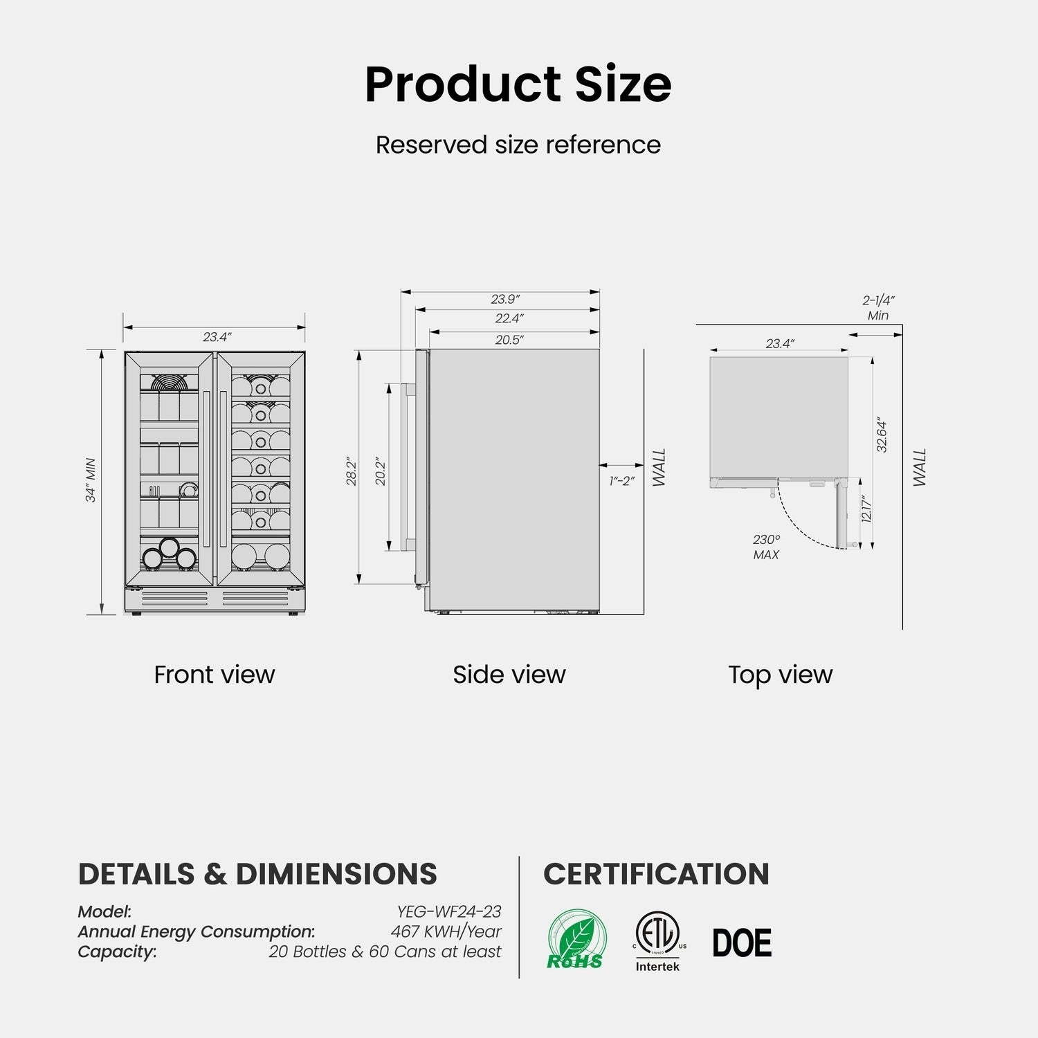 Grande capacité : pouvant accueillir 20 bouteilles de Bordeaux standard de 750 ml et jusqu’à 60 canettes de 350 ml, le réfrigérateur à vin Yeego répond à tous vos besoins en matière de réception. Le côté droit du réfrigérateur est équipé de six clayettes amovibles en bois pour le vin, tandis que le côté gauche offre trois grilles métalliques réglables pour les boissons, offrant ainsi une solution de rangement flexible pour différentes tailles de bouteilles et de canettes.