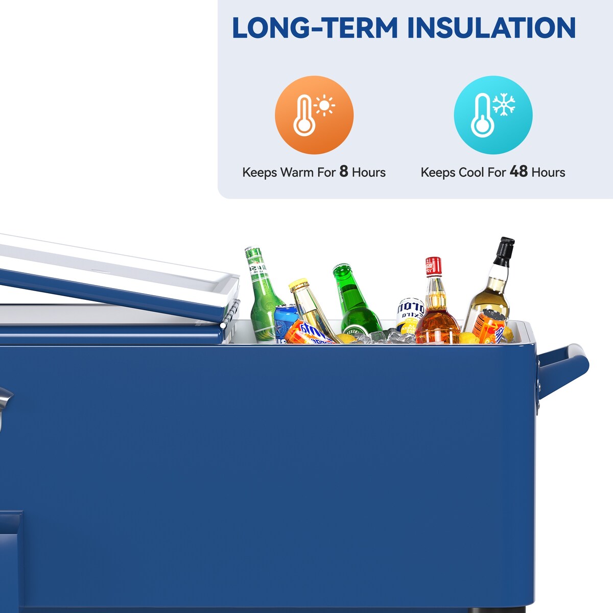 Sublimez vos réceptions en plein air avec notre glacière de terrasse de 80 litres. Elle offre une grande capacité de stockage pour conserver plus de 100 canettes ou plus de 55 bouteilles au frais jusqu'à 48 heures ou au chaud jusqu'à 8 heures. Pratique, cette glacière portable est équipée de roues pivotantes à 360°, de poignées ergonomiques et d'un espace de rangement supplémentaire pour une expérience de rafraîchissement ou de réchauffement en extérieur optimale. Elle peut contenir plus de 100 canettes ou plus de 55 bouteilles, conservant vos boissons au frais jusqu'à 48 heures ou au chaud jusqu'à 8 heures. Idéale pour les rassemblements ou événements en plein air, elle vous garantit un large choix de boissons à portée de main. Facile à transporter, elle se monte et se démonte facilement pour un transport pratique. Emportez-la sans effort pour vos pique-niques, vos séjours en camping ou toute autre aventure en plein air. Dotée de roues pivotantes à 360° et verrouillables, cette glacière d'extérieur est maniable dans toutes les directions. Transportez facilement la glacière d'un endroit à un autre, que ce soit pour une fête dans votre jardin ou pour un séjour en camping. Conçue pour un confort optimal, cette glacière sur pied est équipée de poignées robustes et ergonomiques de chaque côté, pour une mobilité optimale et un transport aisé. Le plateau inférieur de la glacière portable offre un espace de rangement supplémentaire, vous permettant de transporter un maximum d'articles. De plus, un décapsuleur intégré avec récupérateur de capsules sur le côté facilite l'ouverture des bouteilles et la récupération des capsules.