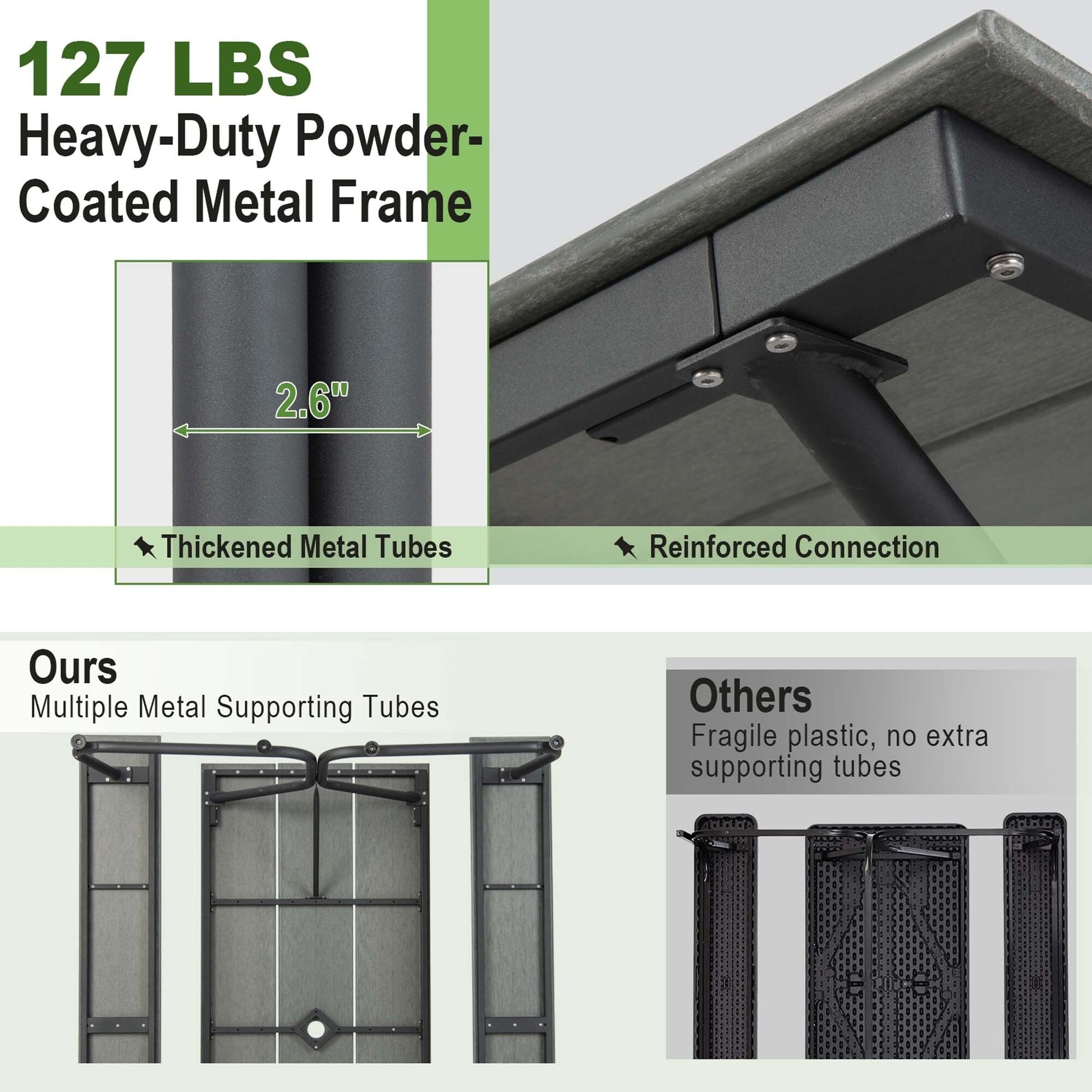 Fonctionnalité Le produit est livré en 3 cartons et le délai d'arrivée peut varier, le kit de vis est dans le carton 1 La table de pique-nique peut supporter jusqu'à 350 lb, chaque banc peut supporter jusqu'à 1100 lb La grande table et les 2 bancs peuvent accueillir jusqu'à 8 personnes, idéales pour les réunions de famille ou entre amis Equipé de 8 repose-pieds réglables, gardant une grande stabilité sur divers terrains Le cadre en métal revêtu de poudre à haute résistance n'est pas facile à rouiller, à peler ou à écailler Les nôtres adoptent plusieurs tubes de support en métal, et d'autres adoptent du plastique fragile, pas de tubes de support supplémentaires Fabriqué en matériau HDPE de haute qualité, résistant aux chocs, protection solaire et facile à nettoyer Traité avec une imitation de grain de bois, vous procurant une sensation naturelle et haut de gamme Conçu avec un trou de parapluie intégré de 2,3 pouces de diamètre, adapté à la plupart des parasols