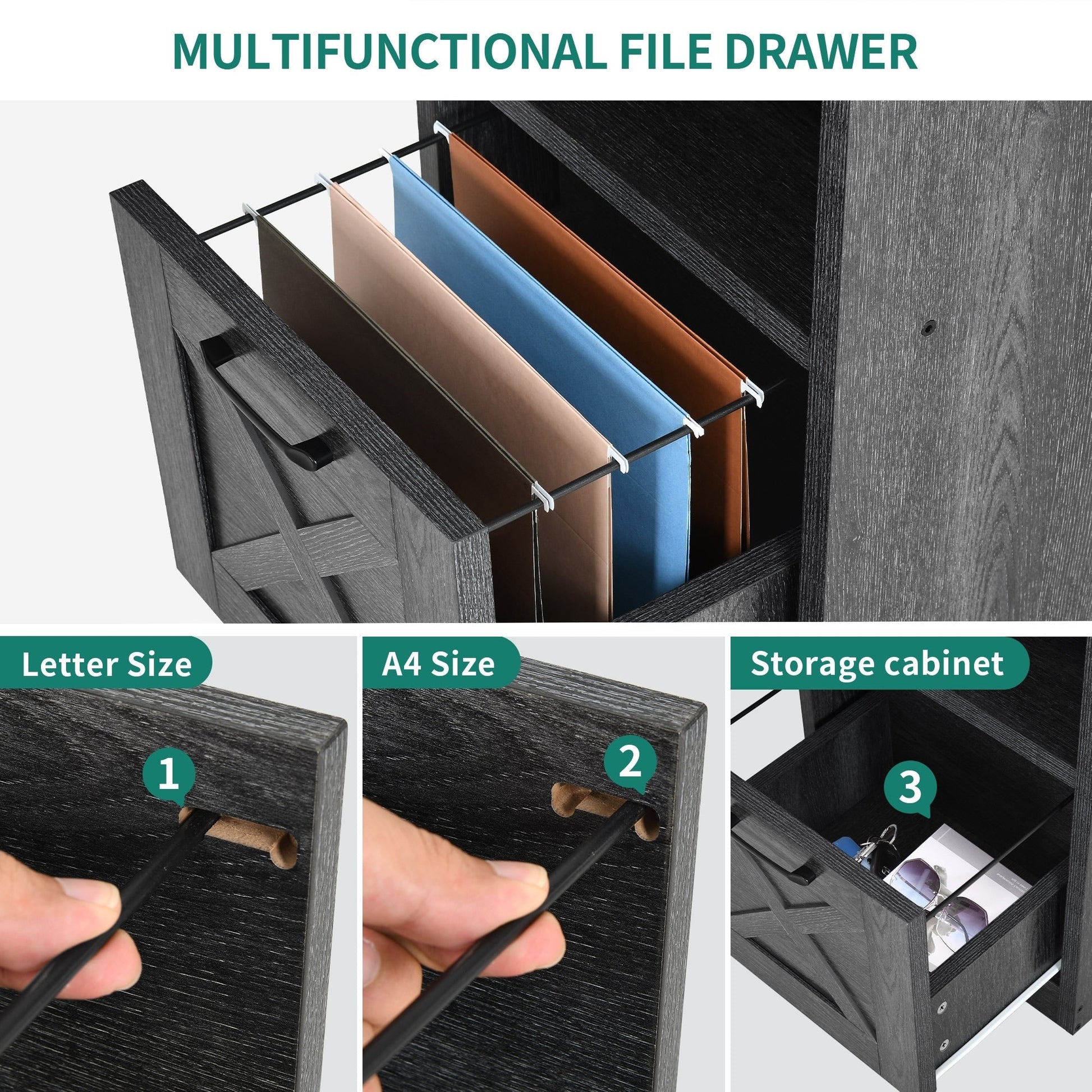 4. Organisez vos affaires et gagnez de la place avec ce bureau d'ordinateur en L. Il comprend un tiroir classeur avec barres de suspension réglables pour les documents au format Lettre/A4, une armoire de rangement et deux étagères ouvertes pour ranger livres, magazines, dossiers, lettres et autres fournitures.