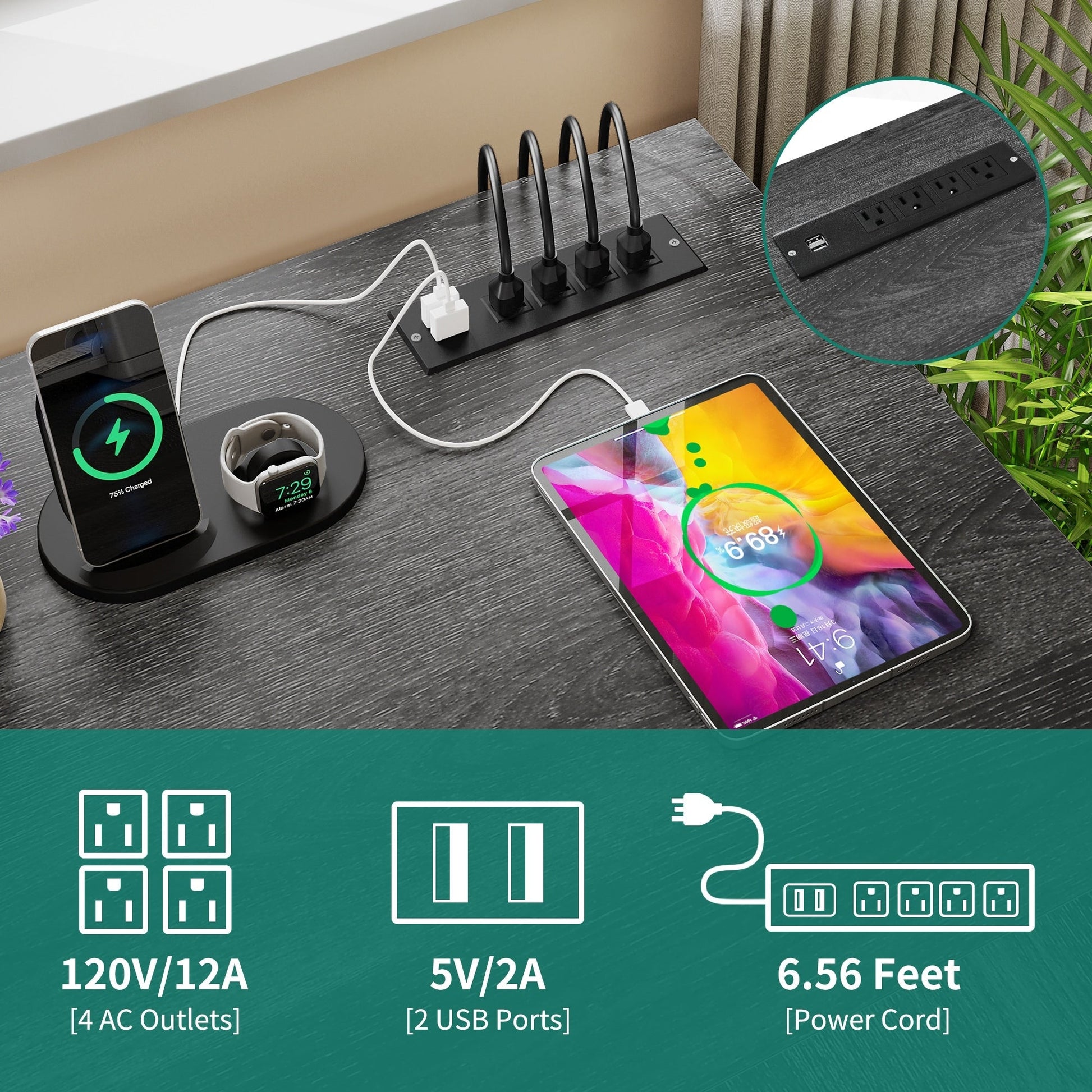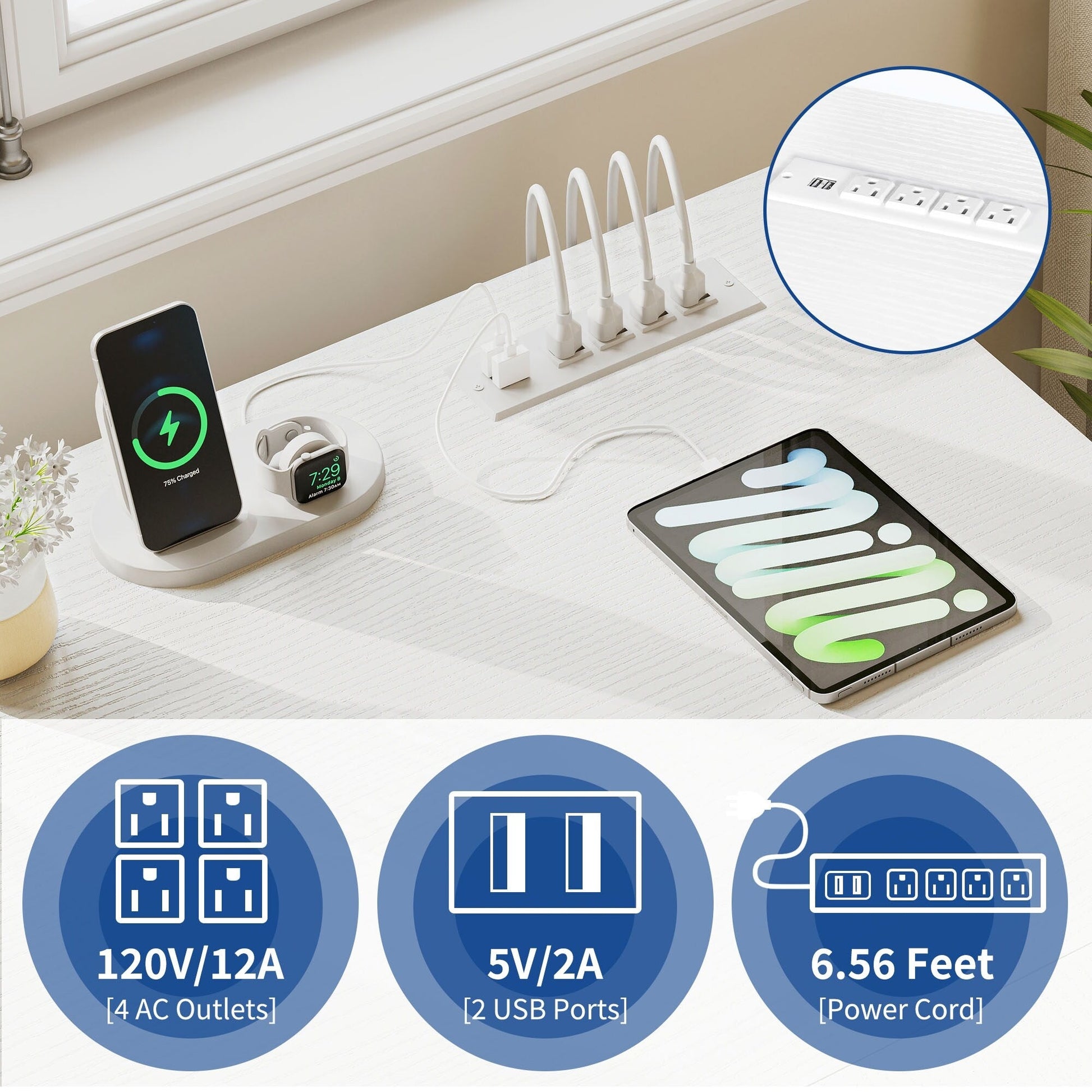 1. Rechargez vos appareils en toute simplicité grâce à ce bureau en L avec tiroirs. Il est équipé de 2 ports USB, de 4 prises de courant et d'un cordon d'alimentation de 2 m pour que votre ordinateur, ordinateur portable, téléphone, tablette, imprimante et console de jeu restent branchés et prêts à l'emploi.